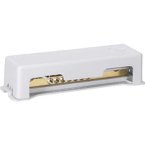 nach VDE 0618, Teil 1, mit hochschlagzähem Polystroldeckel halogenfrei, Schiene Messing, Klemmschrauben Stahl verzinkt, Anschluss für 1x Bandklemme 30x3,5 mm, 1x Rundleiter 8-10mm oder 1x50mm² und 7x Rundleiter 6-25mm² mit einreihiger Beschraubung